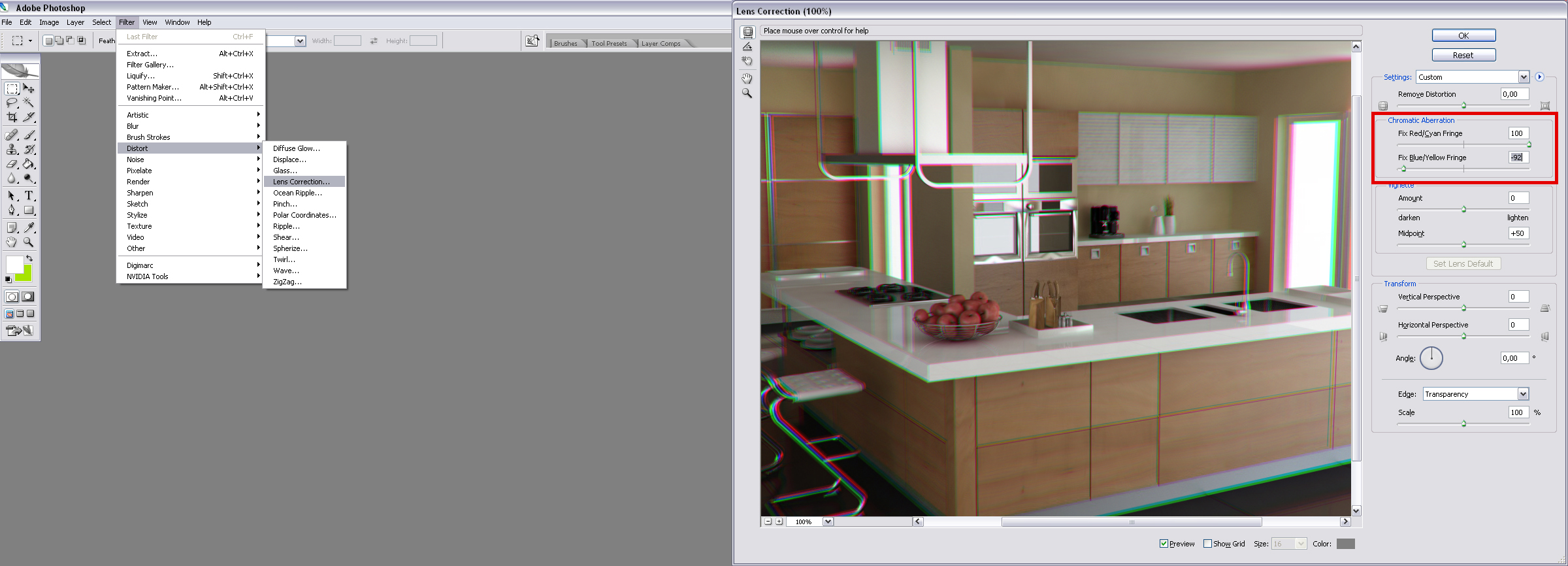 cioè insomma per capirci meglio .... l'aberrazione cromatica assieme alla vignettatura è quell'errore prodotto dagli obiettivi economici. Insomma i fotografi non comprano il canon 18-55mm da 50 euro perchè difetta a motore ma sono costretti a comprare il 17-40mm L oppure il 16-35mm L 24-70mm L tutti attorno ai 1000 euro .... e noi grafici che facciamo mettiamo nei nostri bei rendering tutte ste schifezze.... per farli sembrare delle fotografie da 4 soldi.....
