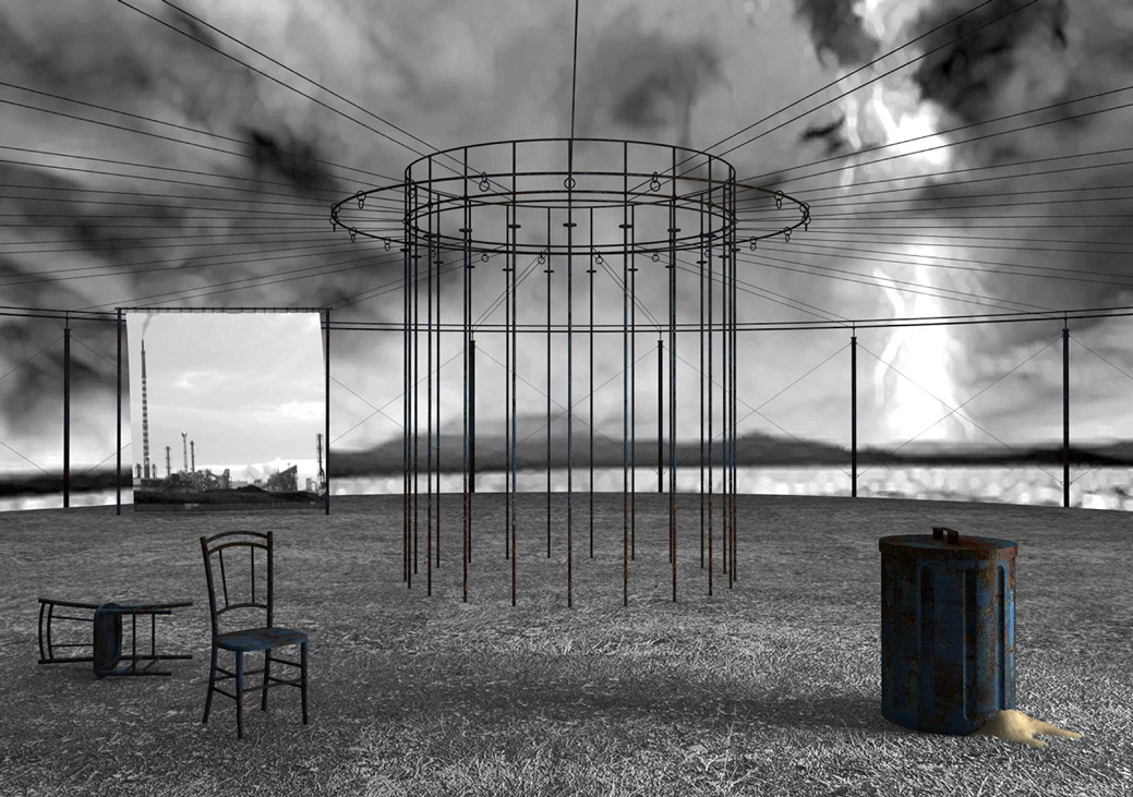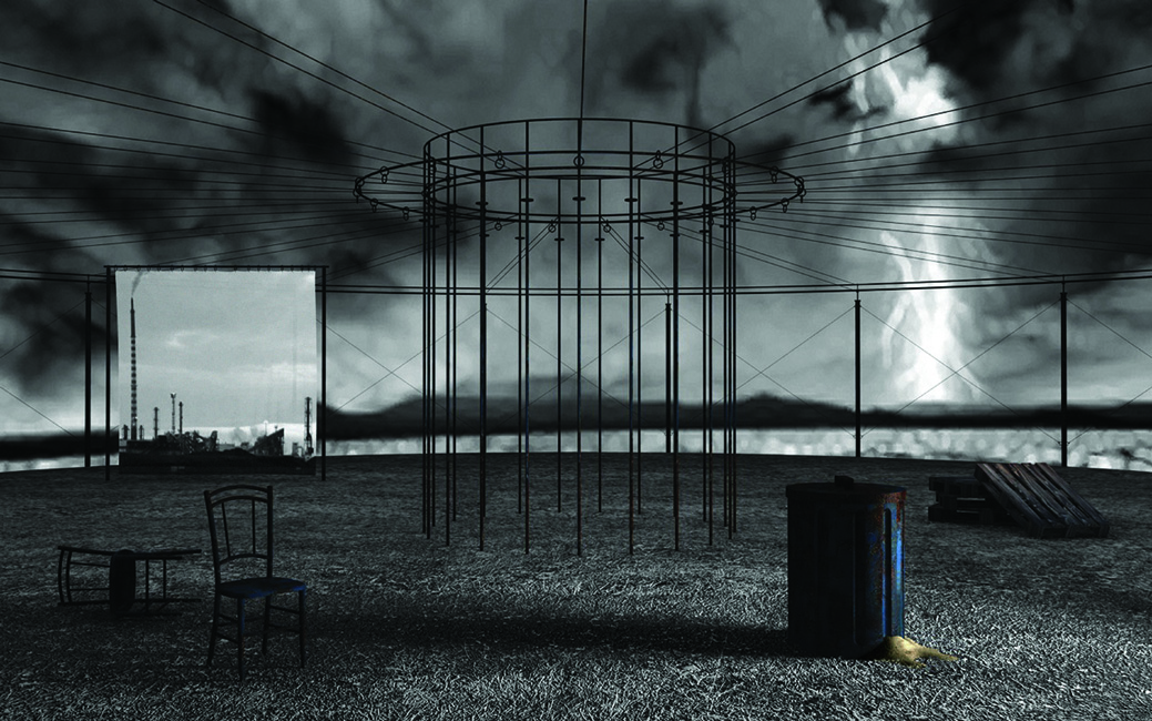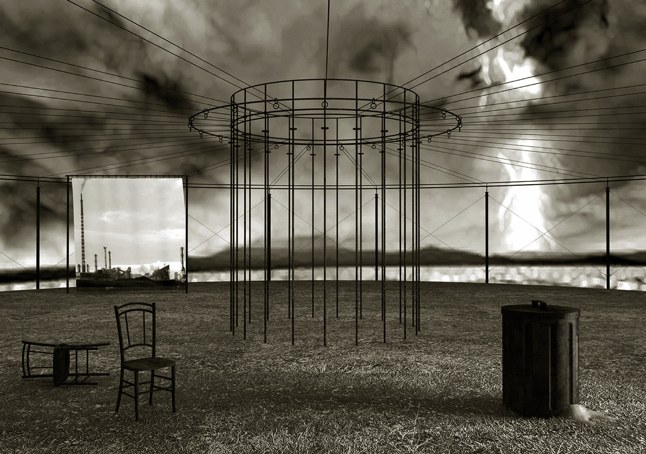 ecco un piccolo sviluppo.. Ho aggiunto la quinta sul fondo con il telo (che poi verrà scosso da vento) e una luce area laterale da Dx che illumina il bidone. Ho delle modifiche e ancora lavoro, ma posto l'ultima immagine.