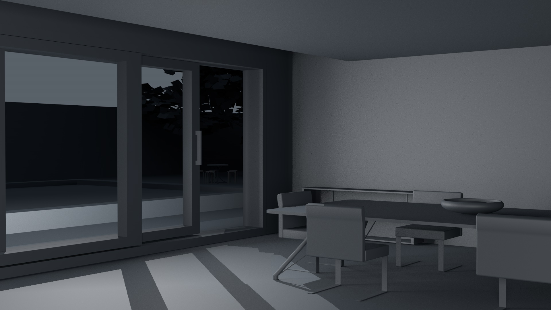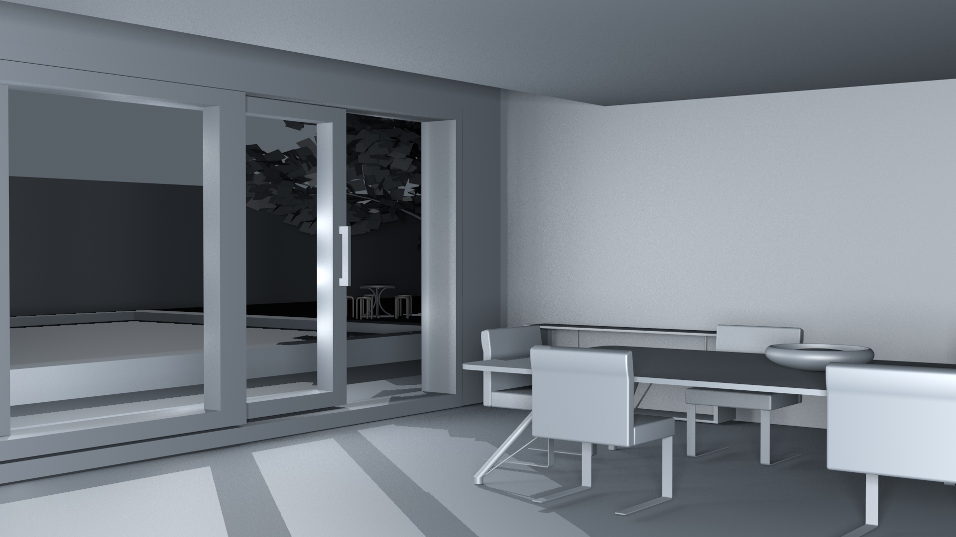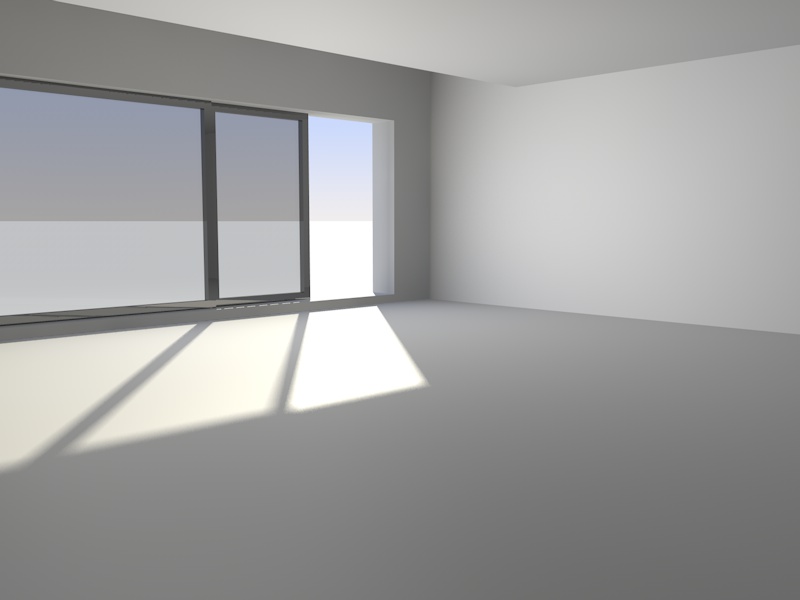 se lasci la porta aperta dovrai dare una leggera trasparenza in meno ai vetri per far notare la differenza di luminosita dove il sole illumina il pavimento direttamente...