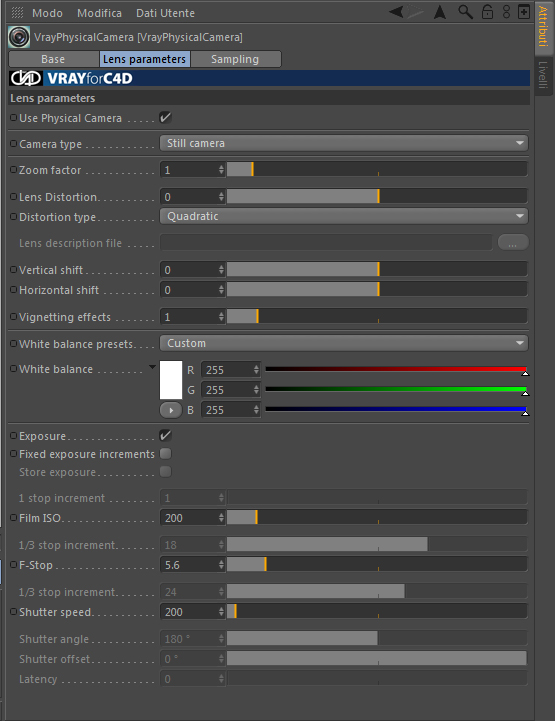 Poi setto la Physical Camera con delle impostazioni fotografiche adatte per un interno; tipo > ISO=200 F-Stop=5.6 e Shutter speed=200.