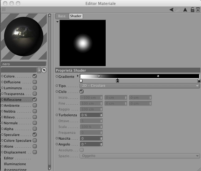 Bisognerà naturalmente fare un po' di prove per regolare adeguatamente l'andamento del gradiente: io nell'esempio ho aggiunto un punto a metà, nero, per "confinare" maggiormente la sfumatura bianca vicino all'oggetto al centro della scena.