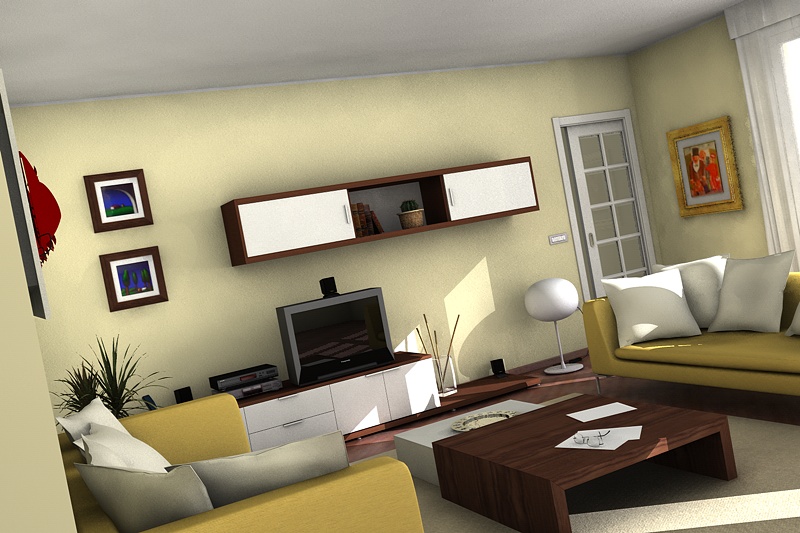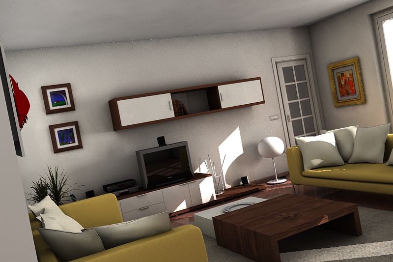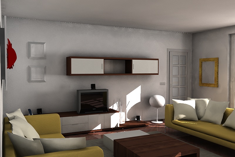Ho iniziato a mettere i materiali, alcuni sono da rivedere come il legno del tavolino, e mancano ancora alcuni elementi come ad esempio un lettore DVD/videoregistratore, le tende ed oggetti vari nella scena. E poi ci saranno da eliminare le solite "patacche" sui muri aumentate inevitabilmente con i materiali...