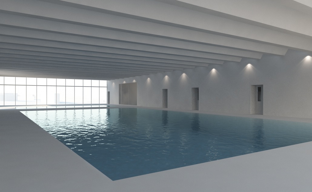 Se vuoi aiutare la GI e la luce ad entrare meglio nell'edificio, metti due luci area in corrispondenza con le vetrate, impostate su Light Portal (sempre asse z verso l'interno) e non una sola grossa sopra la piscina, che sarebbe poco reale.