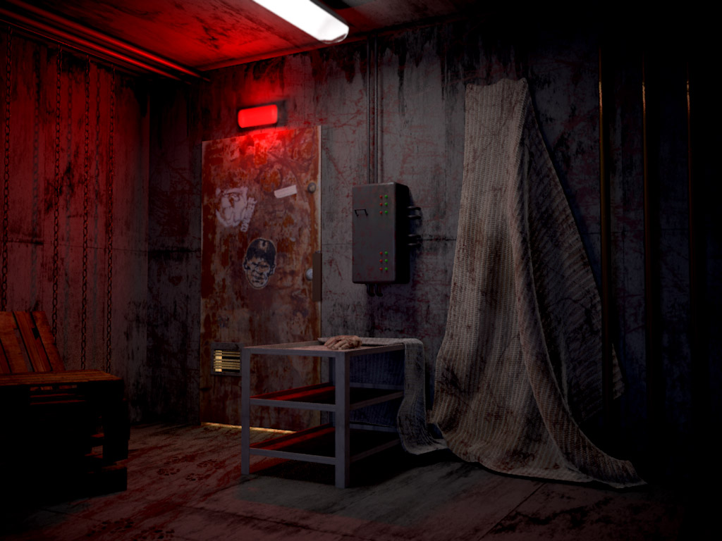 Ho sistemato la luce sotto la porta, ho aggiunto la mano insanguinata sul carrello (per ora), e un pò di sangue qua e là (forse fin troppo).