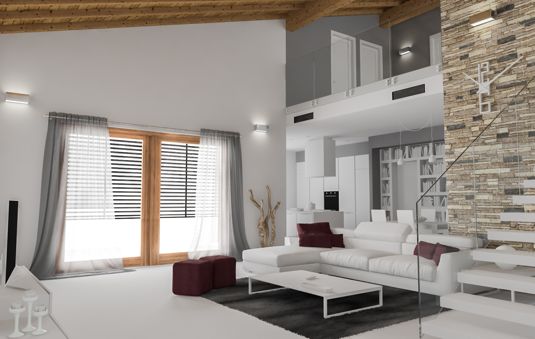vedo solo adesso le immagini, se posso solo esprimere una mia opinione, metterei i parapetti in vetro "incastrati" al piede per non vedere le borchie di fissaggio (ma è un'osservazione di progetto più che sull'immagine) ed utilizzerei il bianco per le bocchette dell'aria condizionata (questa forse è più un'osservazione sull'immagine): quei due rettangoli scuri sono un segno molto (troppo?) forte.