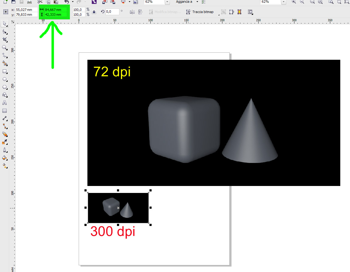 Come puoi vedere quella salvata mettendo i DPI a 300 è stata importata con dimensioni poco superiori a 8x4 cm!
