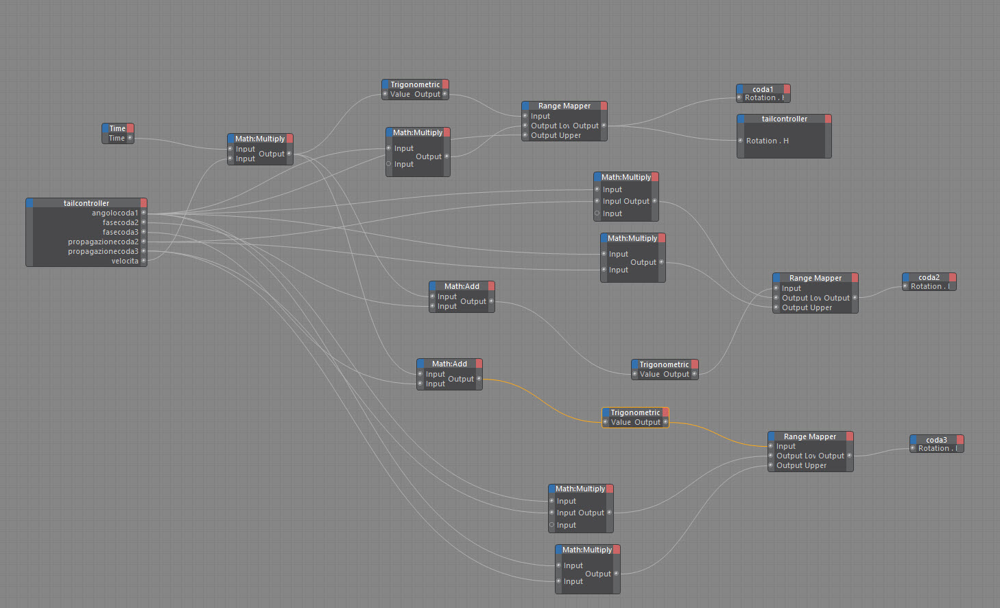 la prima joint è mossa tramite il nodo time e una funzione sin(x), ho controllato l'angolo di rotazione max tramite un range mapper e la velocità di oscillazione tramite dei nodi math