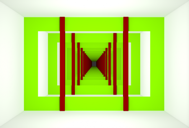 -problema che ho riscontrato è che ad un certo punto, l'effetto di infinito (per il motivo credo di illuminazione globale che non arriva più) arriva ad essere sfumato in nero, sia che si imposti il depth a 100-1000-10000 ad esempio. Ora..non capisco se è un problema di bug o se ci sono altri parametri che entrano in gioco.. comunque vi allego tre immagini dove si vede questo effetto di "rimbalzi" dovuti a come si imposta il trace depth...