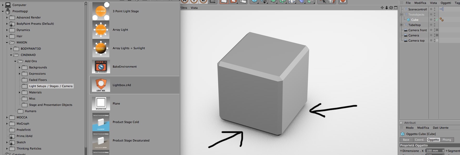 nell'oggetto luce, su ombra, aumenta il valore Mappa Ombre (se utilizzi Ombre Morbide) e sui Settaggi Rendering aumenta i valori di qualità, suddivisione Ombre ecc (dipende anche dal tipo di render che utilizzi...)Nei presettaggi di cinema, Light setup / ..Lightbox.c4d. Qualcuno sà come eliminare quei disturbi d'ombra indicate dalle frecce? E cioè avere un ombra omogenea?