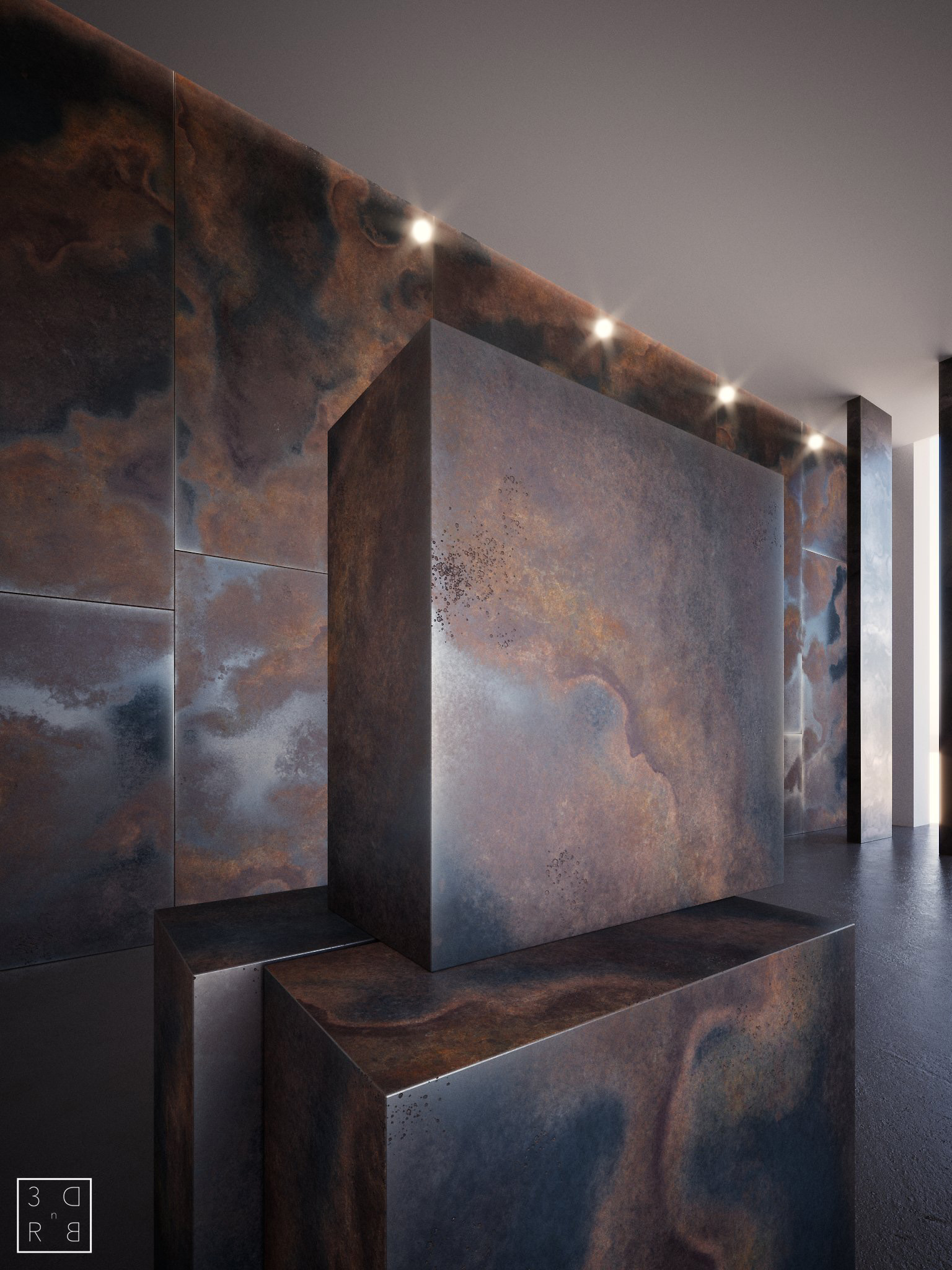 Non so, magari eviterei di far vedere i lampadari, magari spostarli fuori dalla dall'inguadratura, perché un po' vanno a distrarre l'attenzione dell'utente che va a guardare il pannello con le caratteristiche del materiale. Poi renderei lo sfondo un po' più morbido con le sfumature. Parere mio. :)
