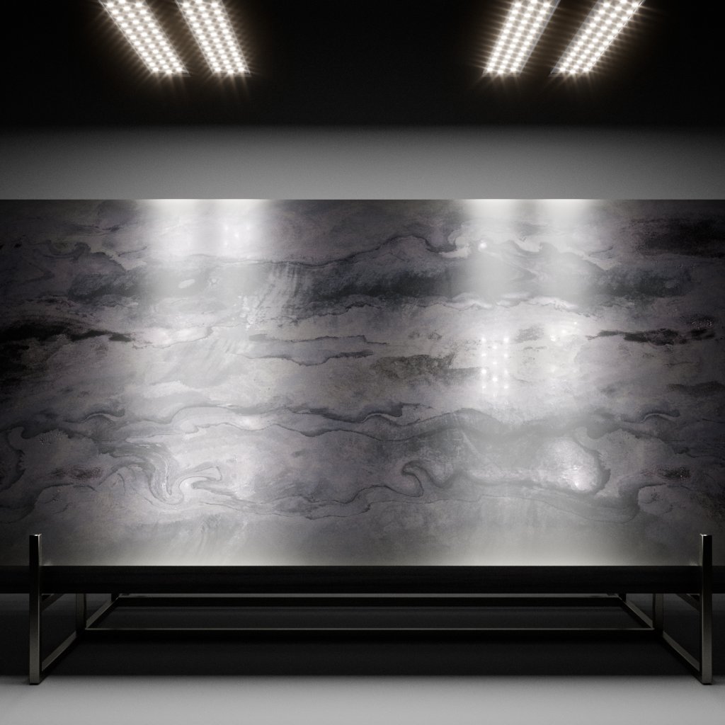 Non so, magari eviterei di far vedere i lampadari, magari spostarli fuori dalla dall'inguadratura, perché un po' vanno a distrarre l'attenzione dell'utente che va a guardare il pannello con le caratteristiche del materiale. Poi renderei lo sfondo un po' più morbido con le sfumature. Parere mio.