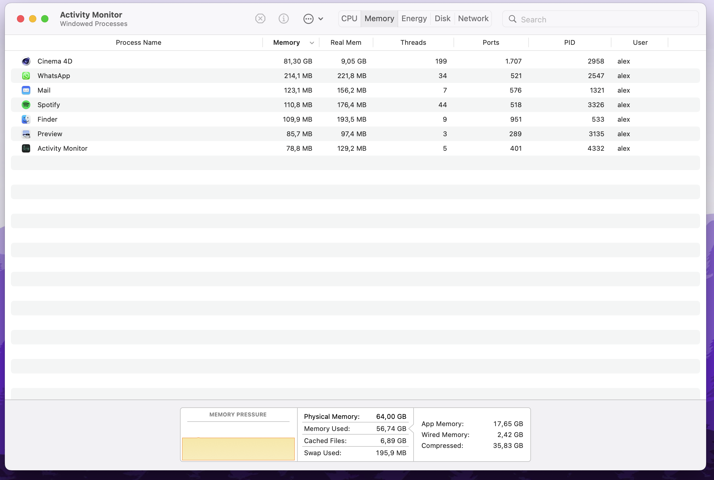 Lascia perdere quello che leggi dove c’è scritto “memoria”, attivati invece la voce “memoria reale”, ti accorgerai che mentre la voce “memoria” aumenta a dismisura (per scrupolo l’ho portata a oltre 100GB, e ne ho installati solo 64 sul Mac Studio appena acquistato), la voce “memoria reale” rimane costante a 3GB ed è quello che l’applicazione sta realmente consumando.