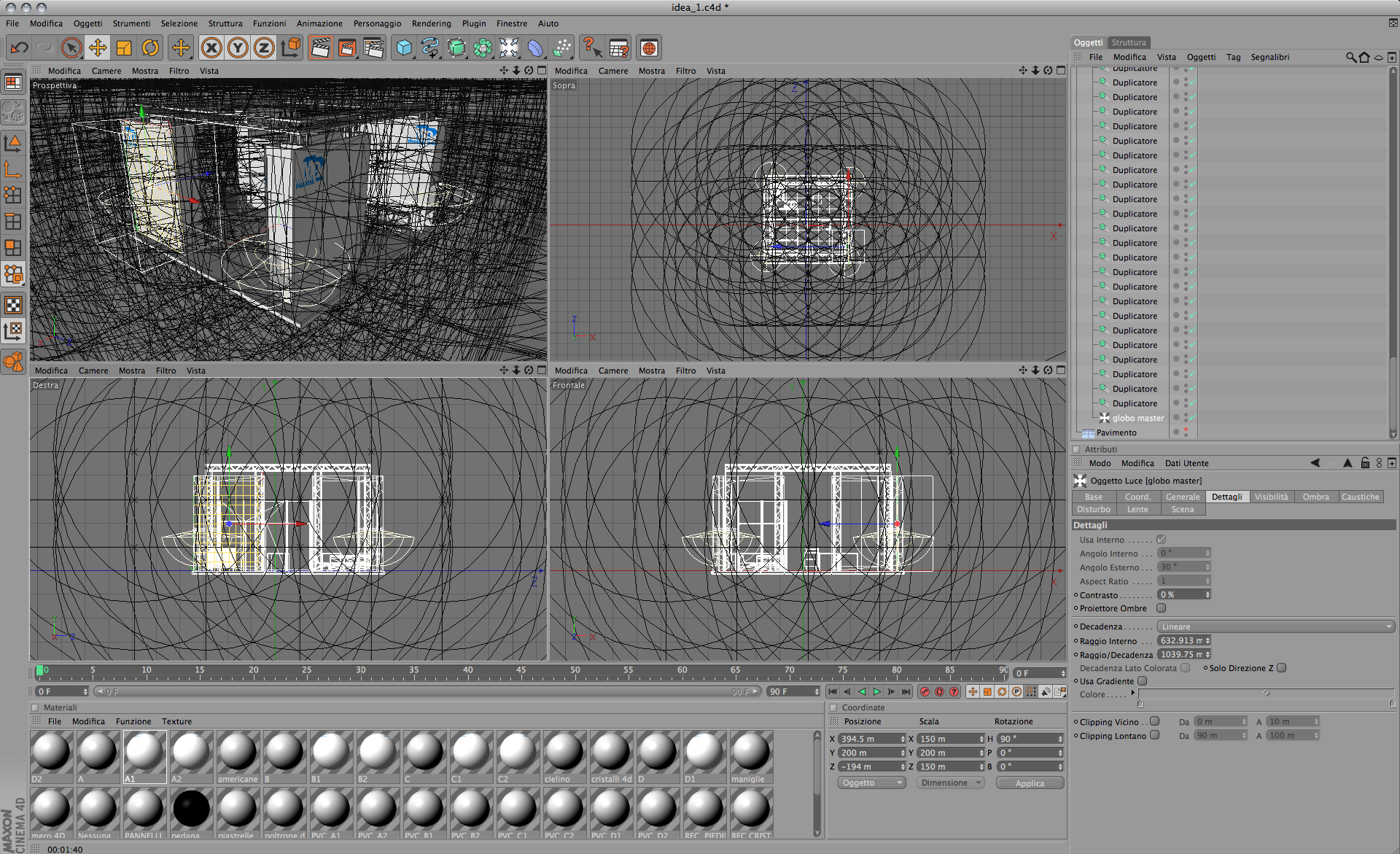 3) trascino il duplicato della luce-omni all'interno della scena, dopo di che con il comando "copia" e "incolla" creo tante copie del duplicato che posiziono all'interno della scena (posizionati vicini e in modo regolare, in modo da formare una maglia fitta di luci-duplicate sui tre assi).
