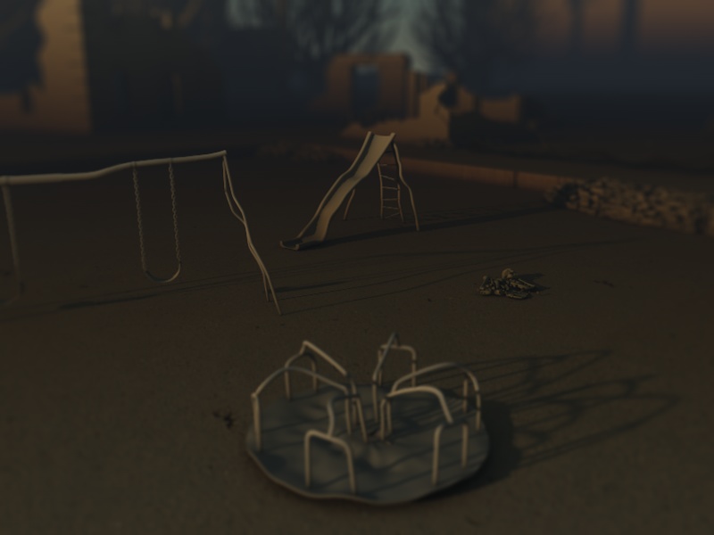 molto meglio!!!...ma sai? forse è ora di cominciare a pensare di movimentare un po il terreno...non trovi che sia un po irreale in un contesto post-olocausto una cosi perfetta situazione del terreno..e poi non sarebbe interessante prediligere una direzione di annichilimento degli oggetti? in fondo l'esplosione avrà avuto una direzione e di conseguenza anche gli oggetti si saranno deformati di conseguenza..e poi questo parcogiochi è davvero troppo isolato..prova a circondarllo da una rete metallica o una staccionata sempre deformata ovviamente! cmq bravo comincia ad avere una sua atmosfera!!!
