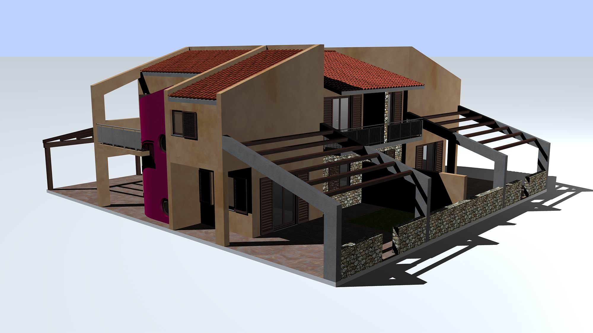 io la vista della lotizzazione la farei con una bella tinta unita....e poi le viste delle singole unità cercherei di farle "fotografiche"... affidandomi alla tua bravura.