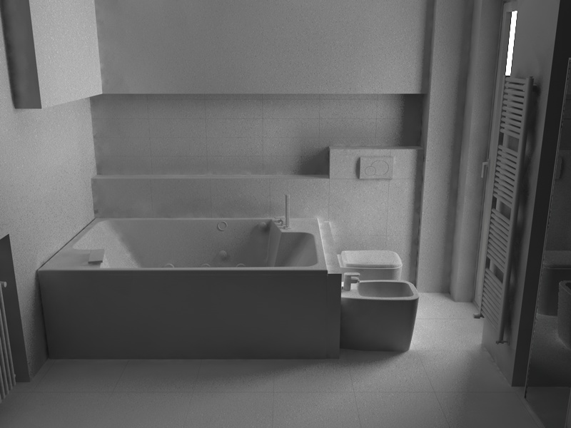 Ecco postate le ultime modifiche, oltre ad alcuni dettagli di modellazione (piastrelle termosifone) ho fatto delle prove aumentando l'area di decadenza della luce area posta sulla finestra come da consiglio e questo mi sembra il miglior risultato, per ora non ho ancora aggiunto la luce proveniente dalla porta per non avere troppa carne al fuoco e rischiare di perdermi in troppe regolazioni tutte insieme