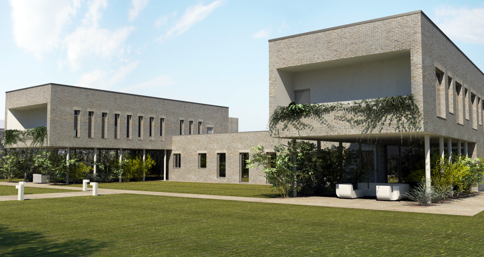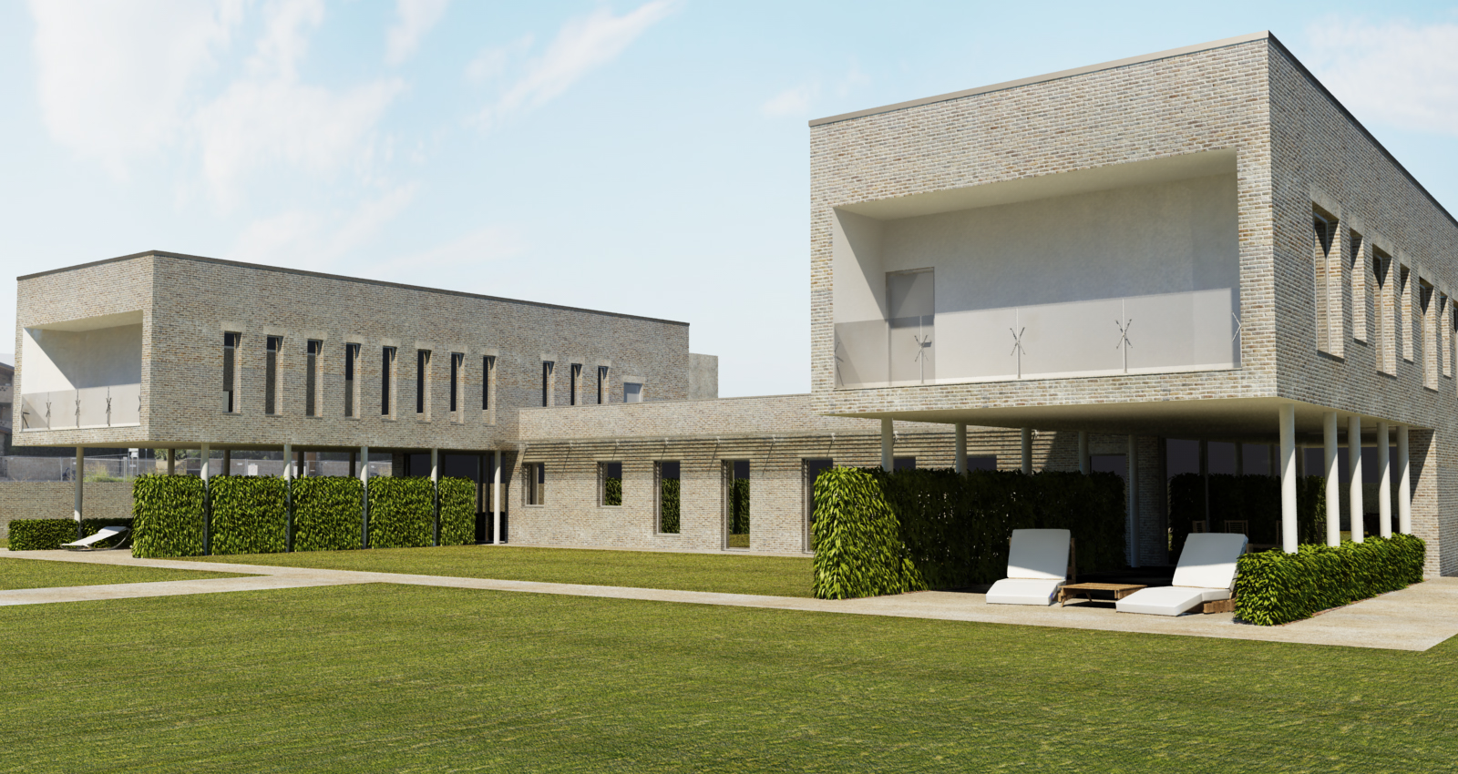 vetri di tutte le finestre a specchio voluti? ..io preferivo il balcone a balaustra..pieno appesantisce molto la composizione..e poi, non so non mi convince molto a livello figurativo le aperture del corpo basso trasversale..un po debole rispetto alla potenza delle ali..hai provato (oddio spero di non sembrare un eretico;)) una pensilina unica e lunga, magari acciaio-vetro sopra le succitate aperture? ti proporrei anche di fare una prova con un colore piu chiaro per la fascia intorno al muro d'attico, un ultima nota, la struttura è in c.a. giusto? quindi la differente posizione dei laterizi sull'architrave delle finestree porte è piu un omaggio, estetico no? ..hai provato a fare lo stesso discorso sulle grandi aperture a fine ala? non so sarebbe interessante vedere che effetto fà! (ritornando alla cosa dei balconi pieni e non, visto che i pilastri sono cosi dietro rispetto all'aggetto aver meno peso non sarebbe poi cosi male a fini statici)