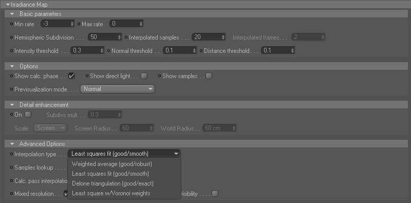 Allora partendo dal presupposto che l' Irradiance map è un metodo di approssimazione delle primary bounces (PB) della GI di Vray ci sono vari tipi di interpolazione da poter scegliere... la "least square fit" che è un metodo blurry e la "Delone Triangulation" che è un metodo preciso... e altri sui quali non ci soffermiamo.
