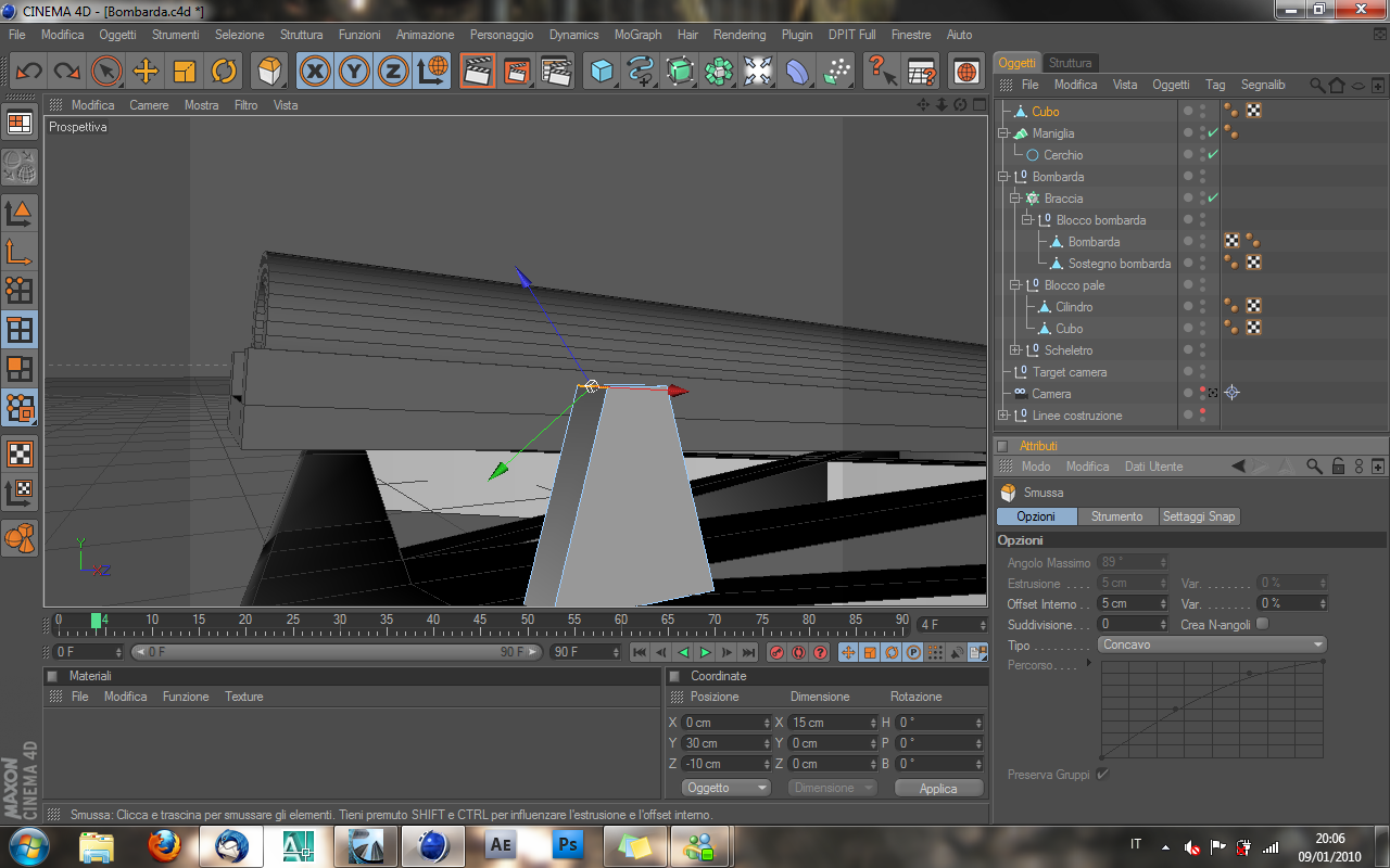 Finalmente ho trovato un attimo di tempo per ritornar a lavorare sulla Bombarda..ma mi sono ritrovato subito davanti a un piccolo dubbio..sto creando i sostegni dei cannoni..devo stondare questo angolo ma non riesco a trovare il modo per farlo..usando il comando smussa anche selezionando convesso, concavo o bezier non cambia niente..mi ritrovo sempre e solo con la smussatura squadrata..qualcuno può aiutarmi a risolvere questo problemino???anche con metodi alternativi volendo..