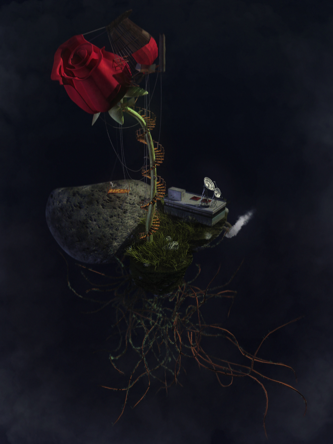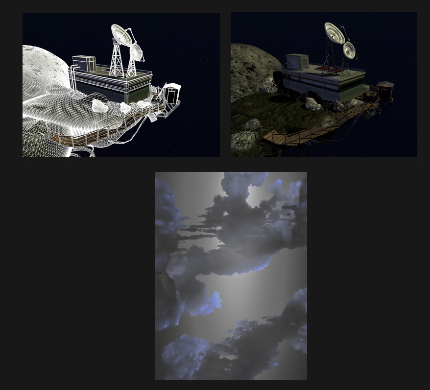 Pensa che questo progetto nasce da un test per la dinamica delle zolle sollevate da un piede che corre su un prato ... cercavo di aumentare il dettaglio delle suddette e mi sono ritrovato quella composizione iniziale, sembrava un piccolo frammento di pianeta sospeso nel vuoto ... :-)