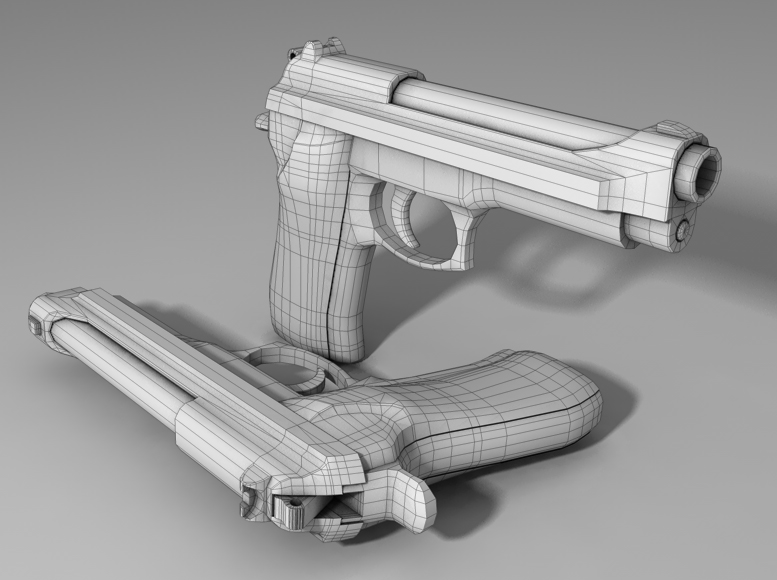 Mi sto occupando della realizzazione della pistola delle guardie. E' una Beretta ed ho preferito realizzarla a basso numero di poligoni a causa del fatto che sarà piccolissima in scena, quindi meglio non appesantire il modello con hypernurbs.
