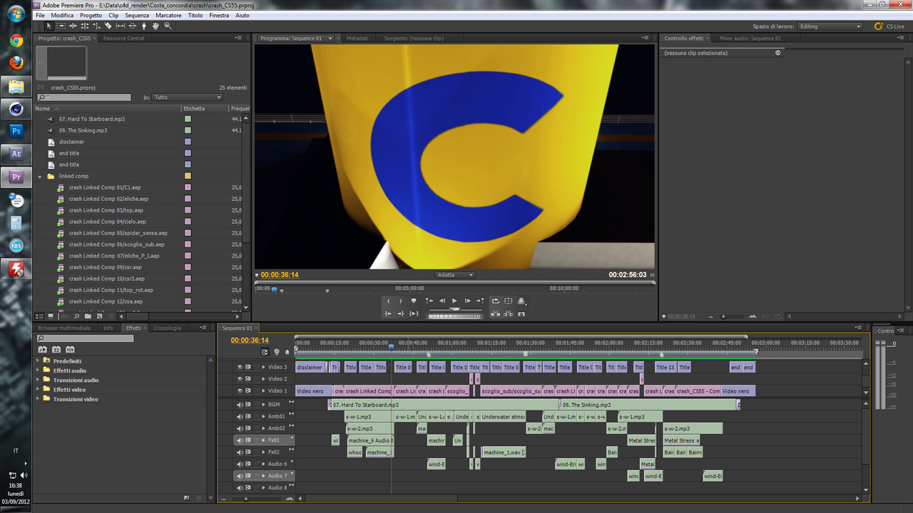Allora, direi che quasi ci siamo, ho completato tutti i render da c4d, il comp con AE e sto terminando il montaggio su Premiere, se tutto va bene (quasi mai) per la settimana sarà online la ricostruzione 3D dell'affondamento. Speriamo.