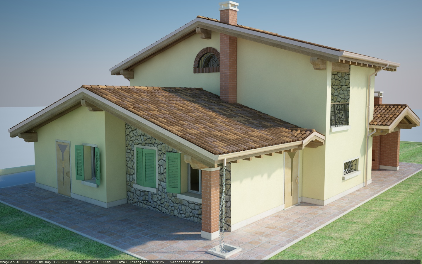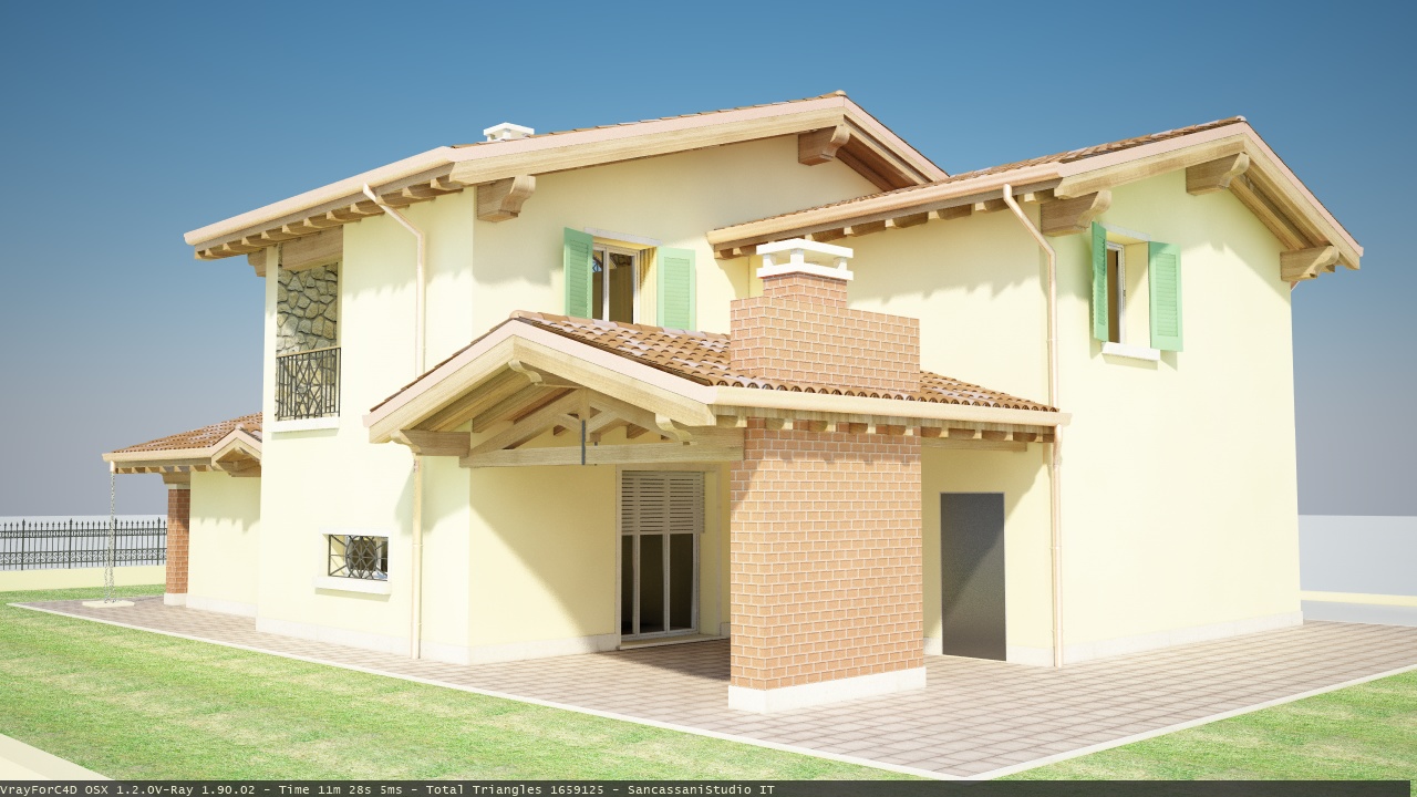 sancassanistudio ha scritto:Rieccomi, ho aggiunto un po di materiali. Lasciate perdere l'erba, che farò con hair e vray proxy ed ho inserito le texture solamente per vedere come mi sparava la luce di rimbalzo sul fabbricato. La paimentazione credevo venisse meglio, poi cercherò anche delle belle texture per i mattoni... Ah, non riesco a girare le texture sule testate delle travi che escono dal tetto... comunque pressappoco i colori dovrebbero essere questi, sia della casa che degli scuri.