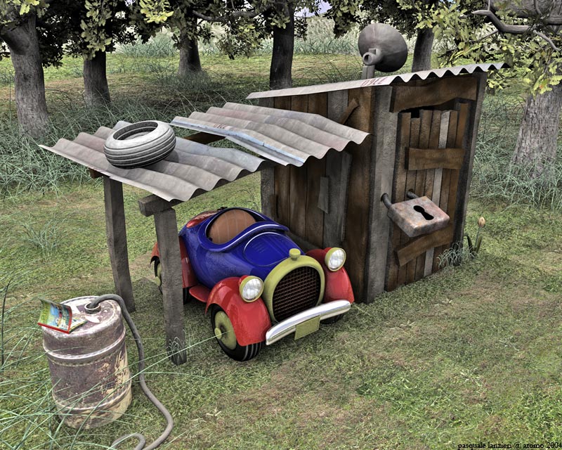 prova a mettere nel canale "diffusion" o il dirty o l'ambient occlusion (plug-in free).. per dargli un po di sporco nelle fessure della auto e "casetta"..