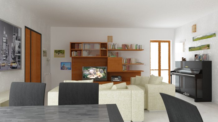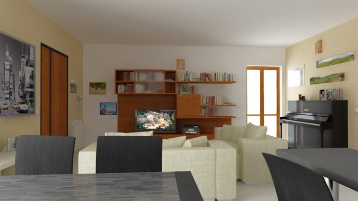 ciao hit! due cose: trovo il lato della della stanza dove c'è la porta un pò piatto non so perchè, forse le ombre sono poco accentuate o l'aberrazione della camera la distorce troppo, poi tu suggerisco un bel zoccoletto! che fa sempre il suo figurone nelle case normali jajaajaj e infine di tirare il divano un pò verso di noi 1) perchè non c'è spazio per passare tra esso e il mobile e anche per utilizzare i cassetti dello stesso. 2) perchè non valorizza il mobile