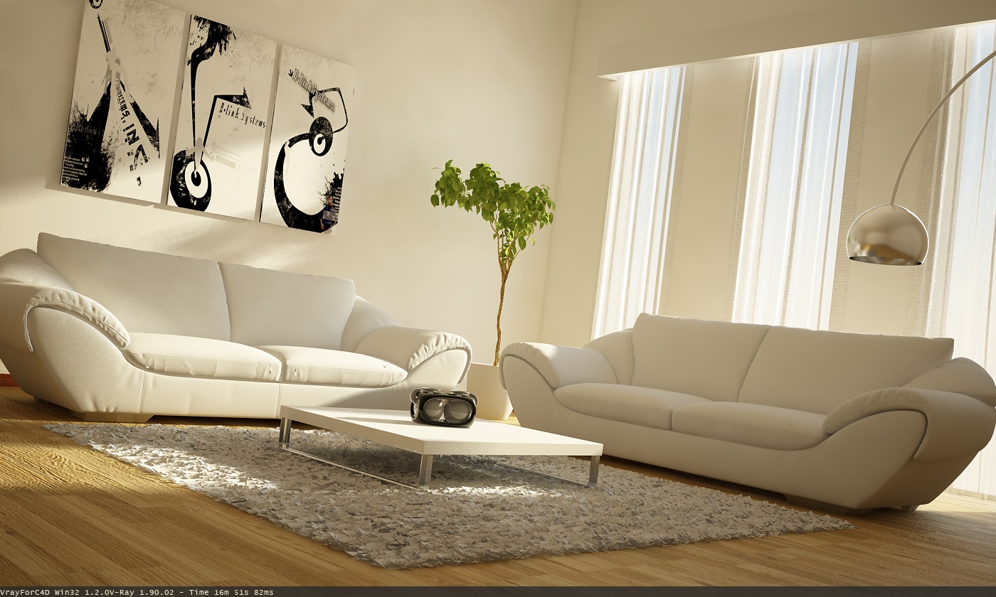 adesso l'immagine è un pelo scura, che CM stai usando? potresti aumentare un po' l'intensità della luce che proietta le ombre sul quadro, da farle fare x bene anche dei divani sul pavimento.anche il parquet secondo me ha bisogno di un re-stylingo una texture cn più definizione o una sistemata al materiale, forse un pelo di riflessione, ma quello dipende dal tipo di legno che vuoi