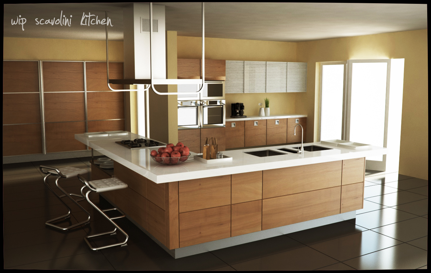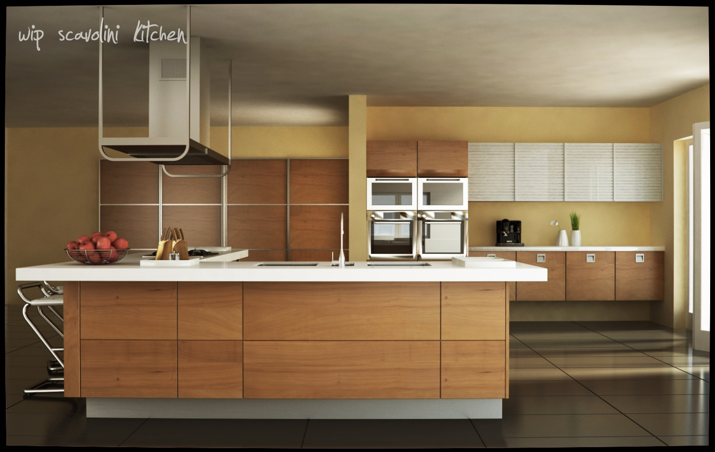 Aumentata la smussatura degli spigoli, ridotti il contrasto e la saturazione... rimane ancora qualcosa da modificare come ad esempio il materiale dei forni e le ante superiori della colonna forno.