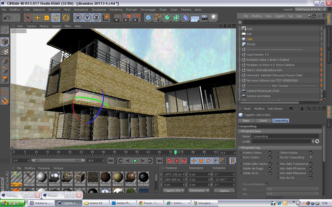 2) un solo cielo... si puo anche dotare di tag rendendolo invisibile alla camera e utilizzare un piano in cui applicare una bella textura di cielo, al piano un tag per non fargli ricevere ne proiettare ombre