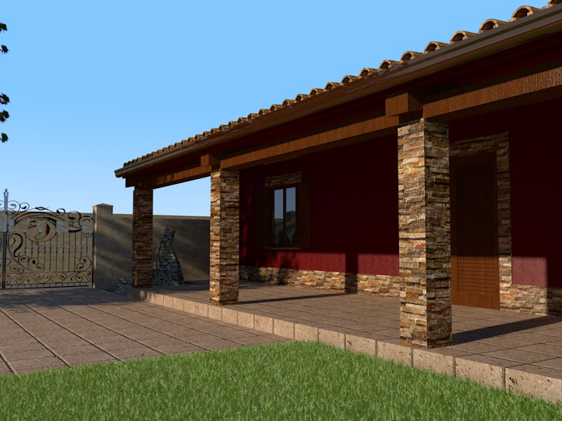 La pietra sul muro della casa (parte bassa) e quella che riveste gli architravi è orrenda. Non utilizzare la stessa texture dei pilastri.