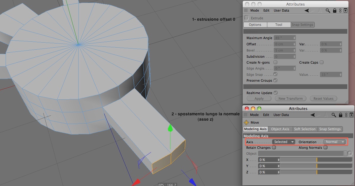 - ora basta che con il mouse afferri la maniglia dell'asse lungo la quale devono essere estrusi e la tiri. In questo modo l'estrusione segue i points dei poligoni "staccati" e risulta parallela