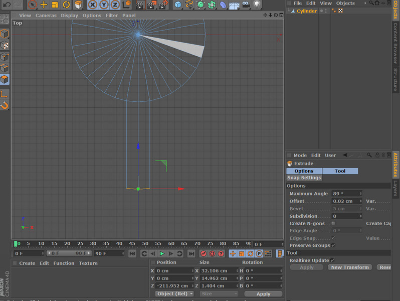 Allora: ho capito qual'è il tuo problema . Il fatto è che Cinema (a torto o a ragione) estrude lungo gi edges di suddivisione della mesh e nel caso di un cilindro gli edges di suddivisione divergono e in tal modo l'estrusione di conseguenza diverge...........