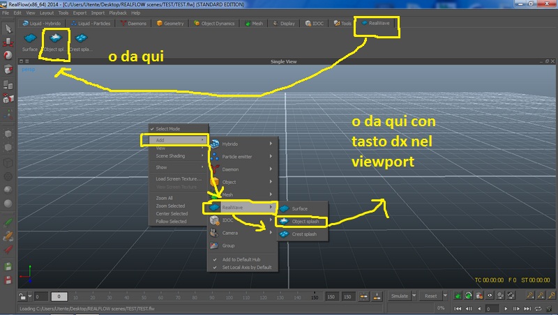 Il setup generico è abbastanza semplice (parlo sempre di Hybrido), devi mettere un domain (che ha bisogno di avere dei confini, quindi ha bisogno di un oggetto che faccia da contenitore), poi un emitter (anche questo ha bisogno di una geometria dalla quale emettere, come ti hanno già detto), poi aggiungi Splash e poi Foam; Tieni presente che Splash genera particelle standard quindi avrai bisogno di un Kill_volume per evitare che volino fuori dai confini del dominio. Infine dal relationship editor colleghi tutto al Domain (con un collegamento extra tra splash e kill_volume).