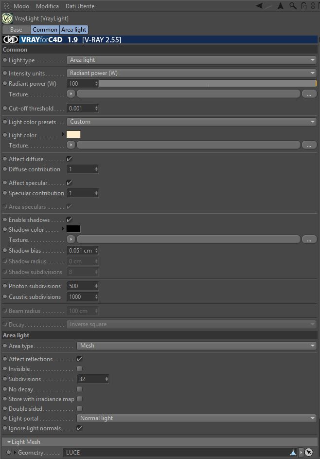 La luce in questione è questa che metto nell'immagine sotto, solo con le subdivision a 64 al posto di 32!