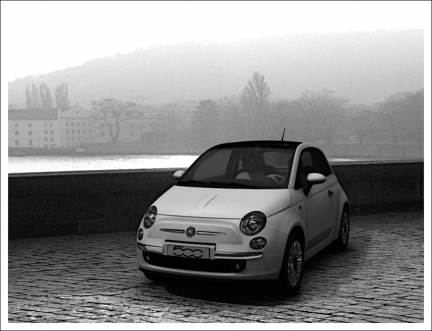 Per l'ombra, pur ipotizzando parecchie spiegazioni che la giustifichino, la prima cosa che si nota è il tipo di giornata uggiosa e coperta e si tende a non accettare a priori un'ombra del genere ma, immaginando che possa essere una grafica pubblicitaria per l'automobile risulta facilmente comprensibile l'uso di riflettori fuori campo, ... ultimo "ma": hai spiegato di voler simulare il sole, questo esclude i riflettori!