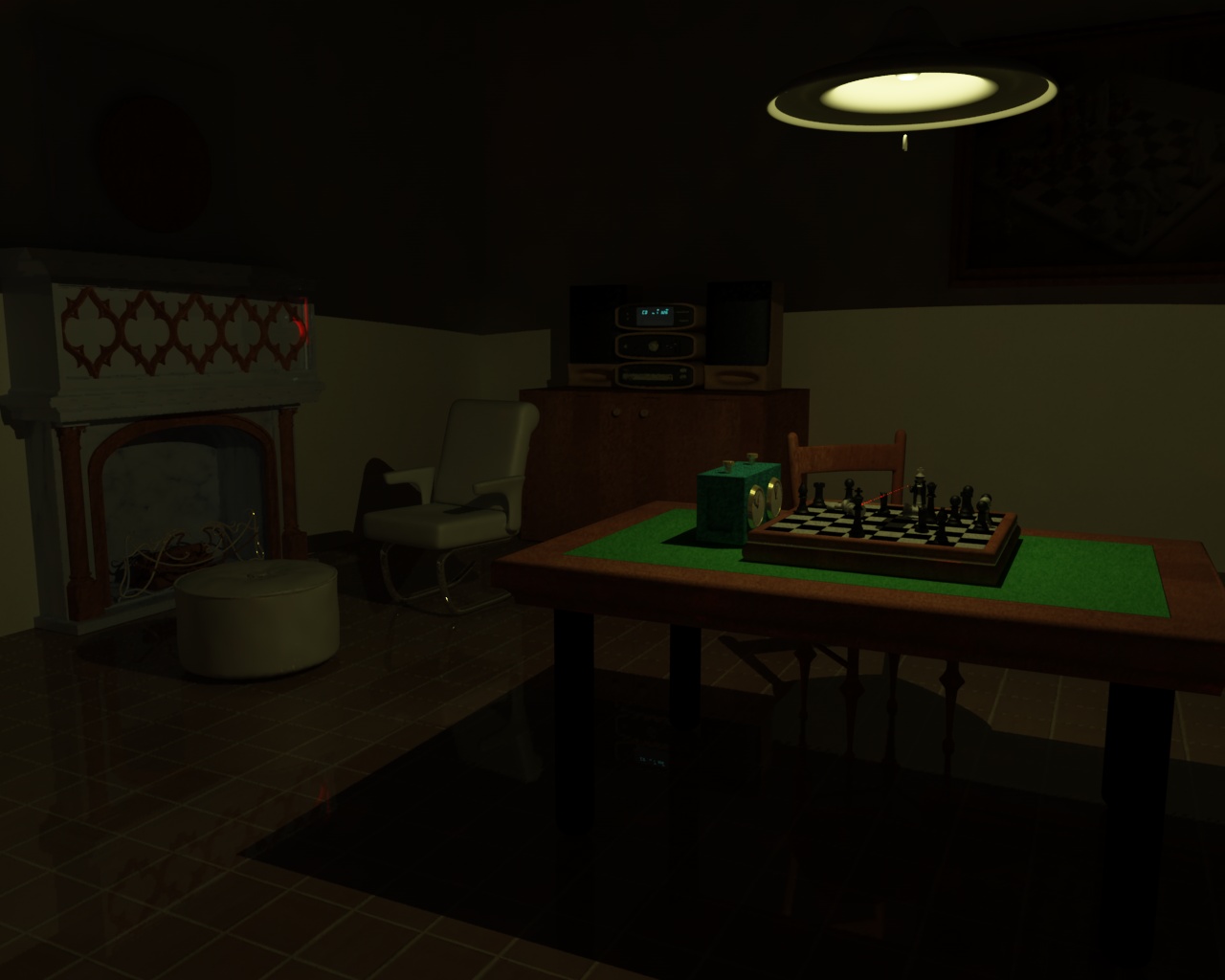 Ho aggiunto mobile+stereo e dall'altra parte (che non si vedono) mobile+televisore illuminato... chi mi spiega da cosa deriva quel bagliore rosso sullo spigolo del camino?? Presumo ia dovuto al laser della pistola.... Ma cosa ci fa lì ???!!!