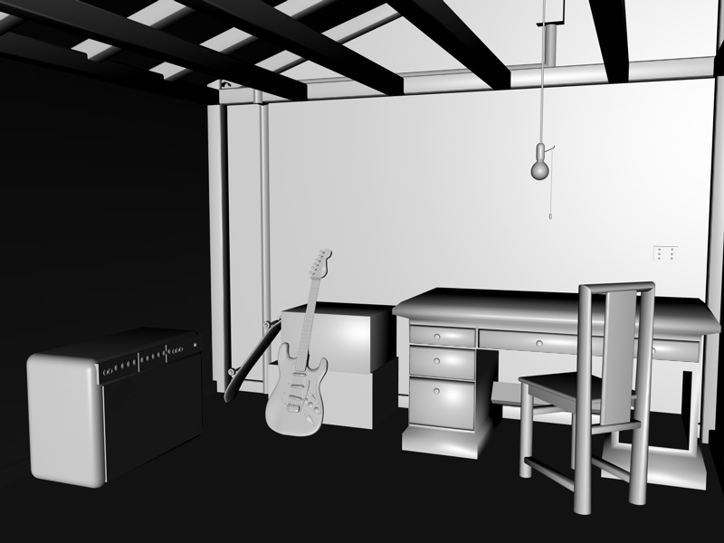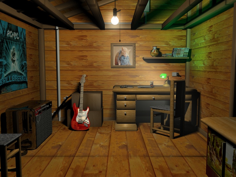 Aggiunte travi laterali indispensaili per la stanza, un paio di spartiti ed un portapenne sulla scrivania infine ancora da aggiungere un poster e un'altro piccolo oggetto. La lampadina risulta finalmente accesa assegnando al materiale un colore uguale alla luce stessa e rendendo la luce visibile all'interno del bulbo. :?: