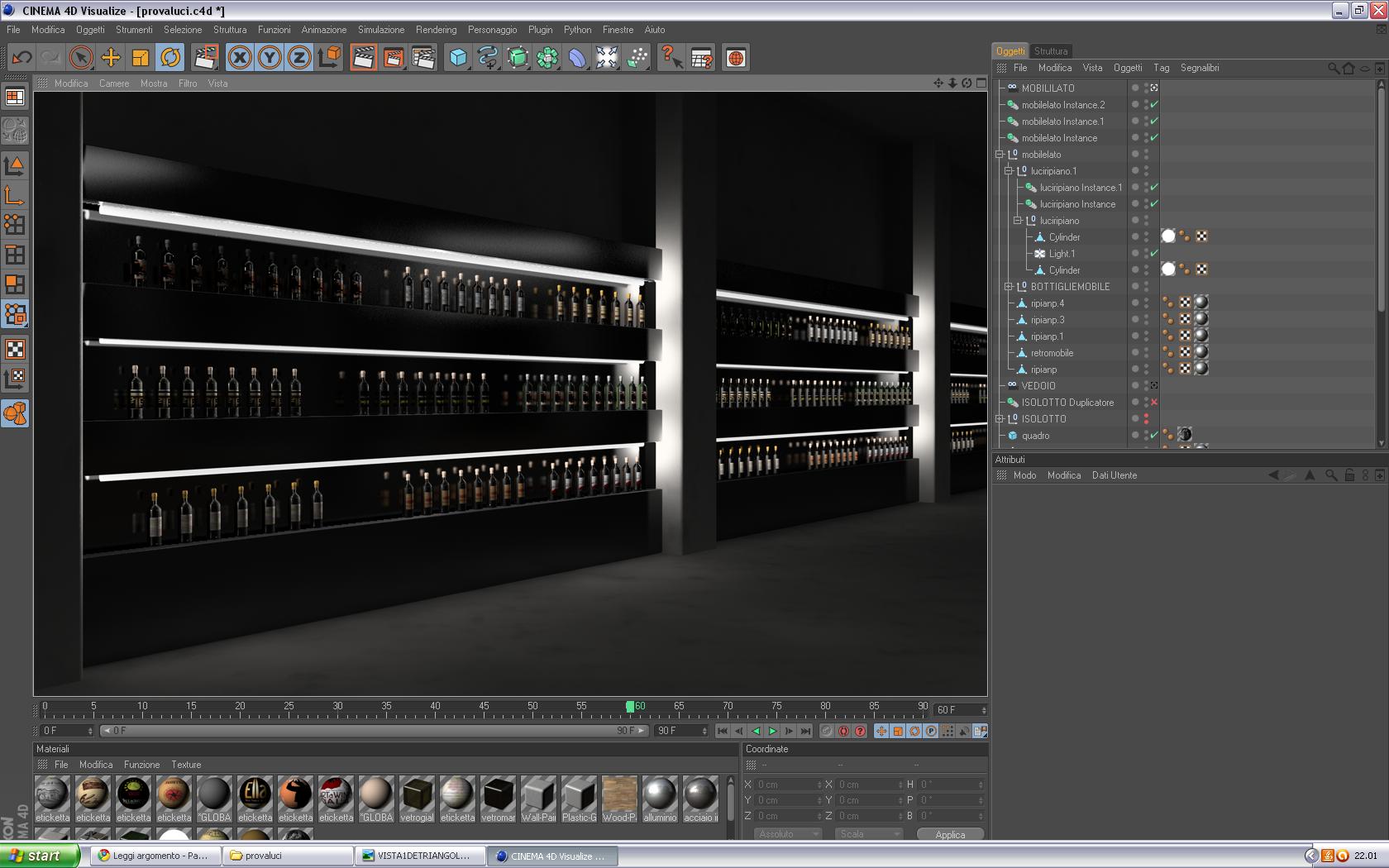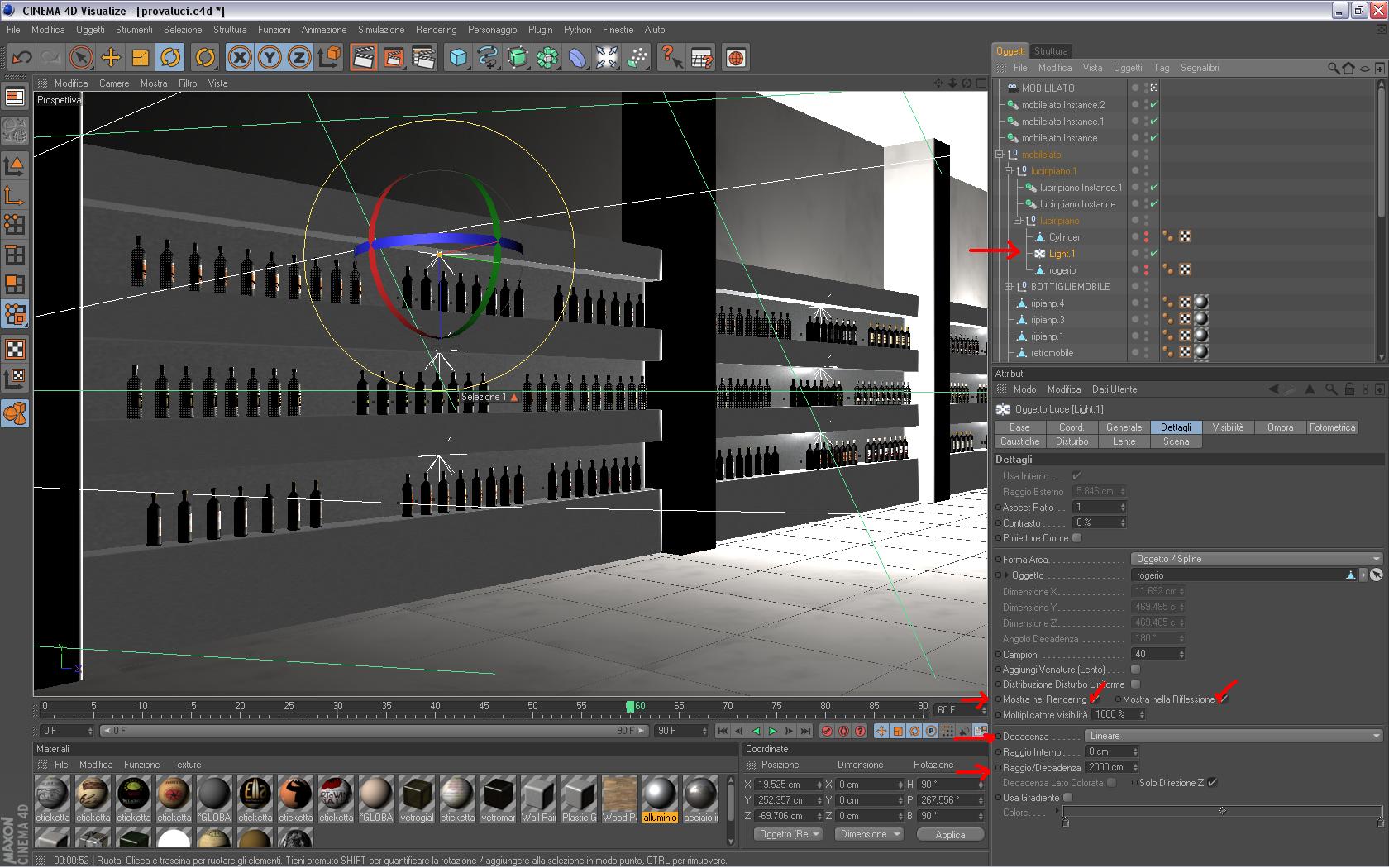Ciao, il motivo perché non ti fa la luce pure sugli altri scaffali è perché sono dei "duplicatori" e (non so perché) se c'è una luce all'interno dell'oggetto originale, come in questo caso, l'opzione istanze deve essere disattivata. Quindi è il caso di creare un duplicatore degli oggetti (scaffale+bottiglie) con istanze attivate. mentre le luci le copi separatamente.