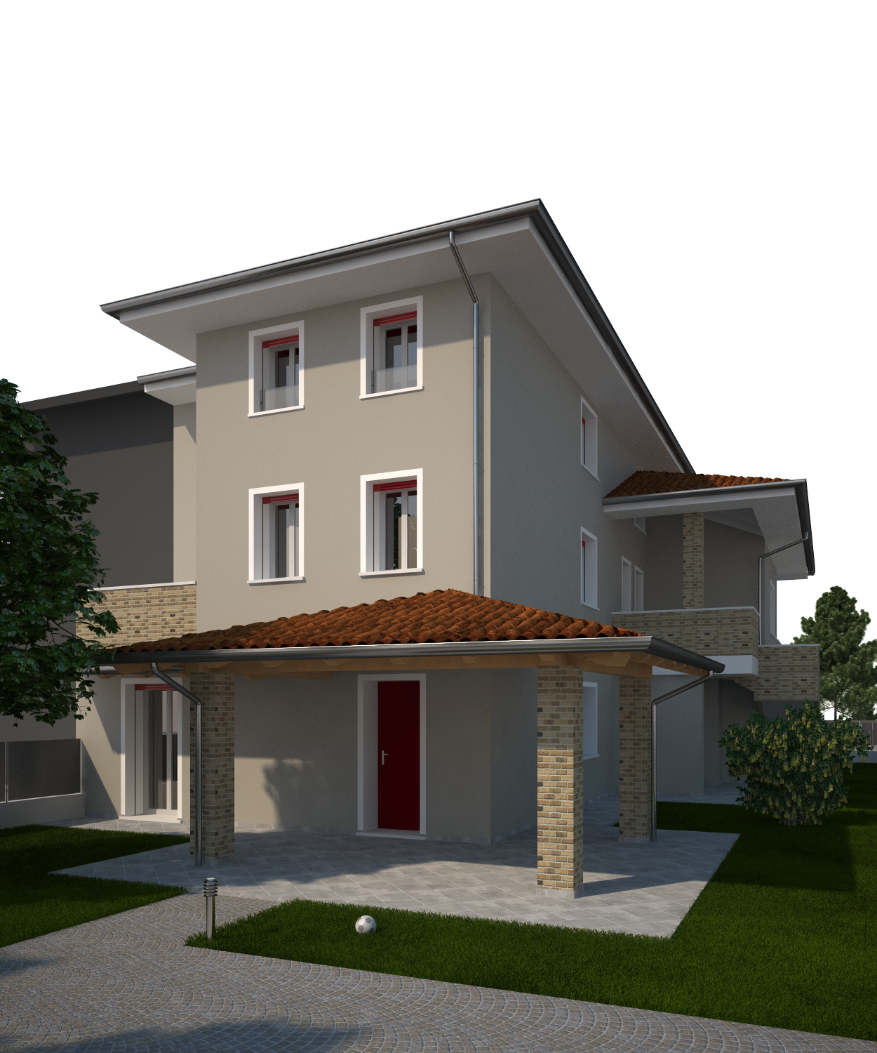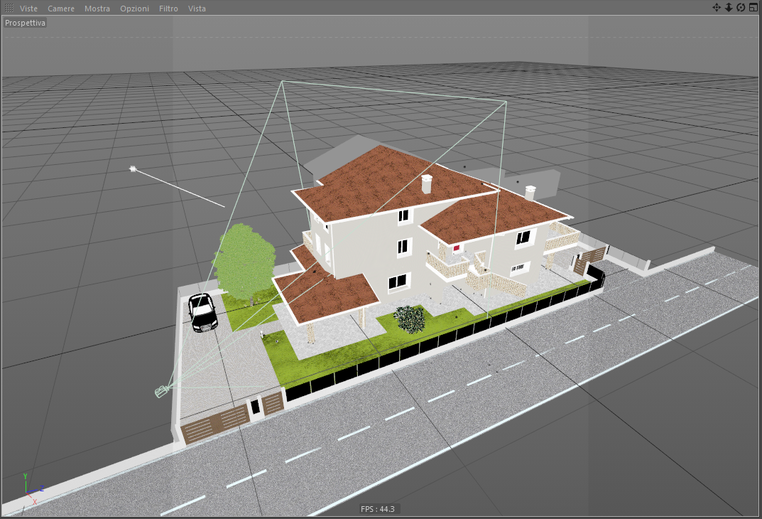 altezza 2m, dimensioni 1:8.3, 1/3 terra e 2/3 cielo, l'edificio adiacente si nota già meno. Ora non resta altro che aggiungere un albero per fare in modo che si intraveda l'ombra nel passo carraio e magari qualche altro in fondo!