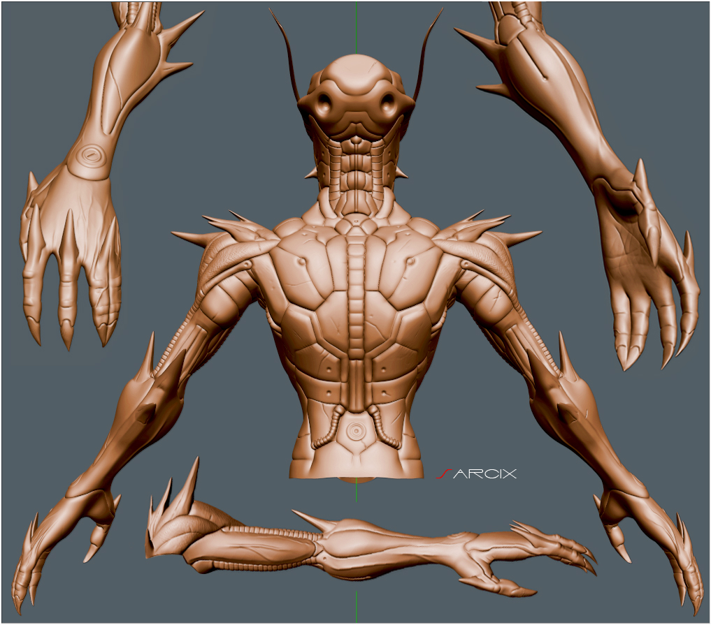 Strada 1-scendi un pò di risoluzione ed inizi a dipingere in Body Paint, esattamente come se fosse un modello normale! Lo sculpt non interferisce con la pittura, e risalendo poi di suddivisione puoi dare gli utlimi ritocchi.