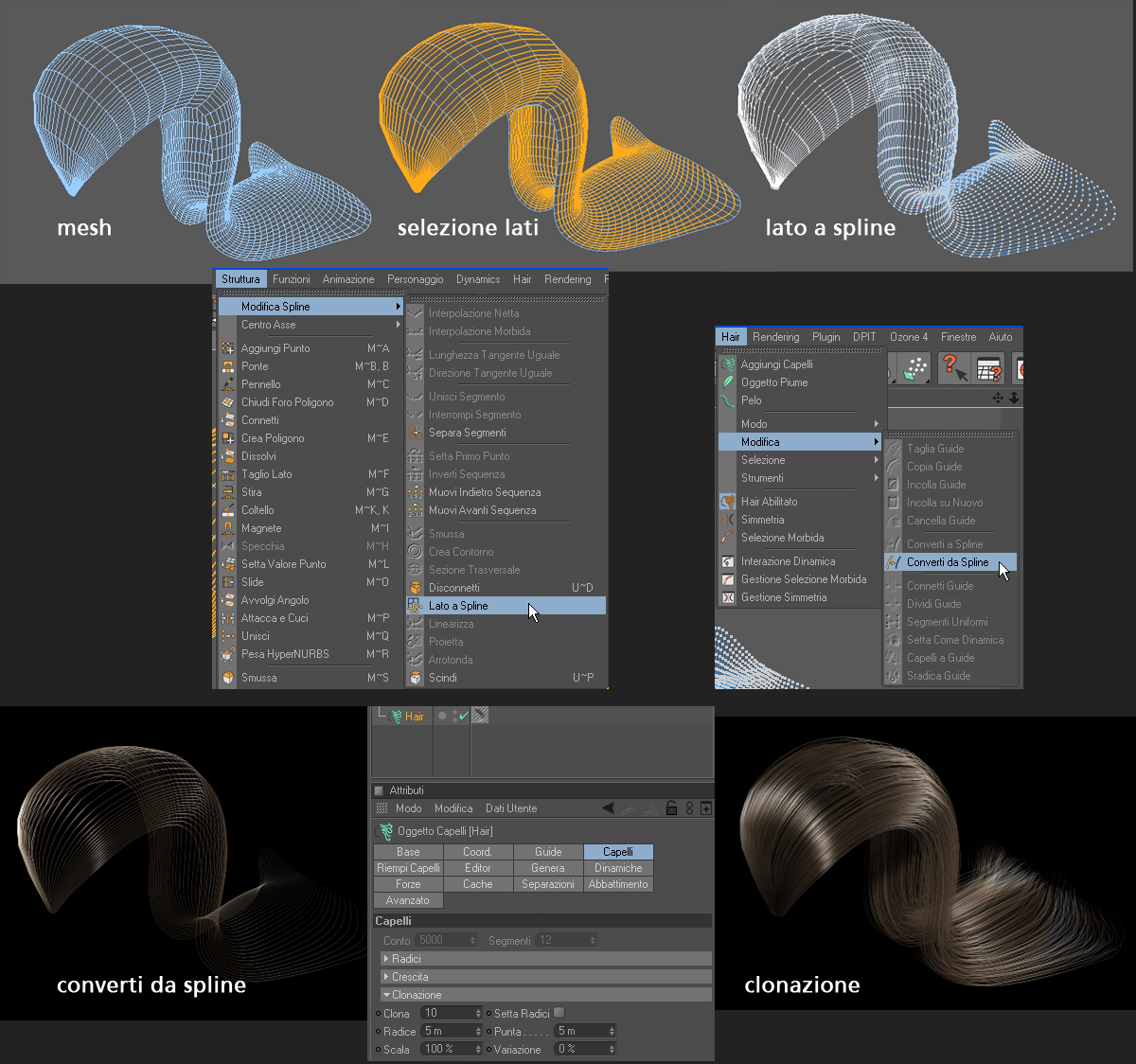 ... e sto anche facendo una serie di prove con hair partendo da modelli poligonali di cui converto i lati utili in spline e quindi in guide hair, ma è parecchio complesso, soprattutto mantenere ordine duplicando i capelli, visto che si crea un arruffamento difficilmente gestibile.