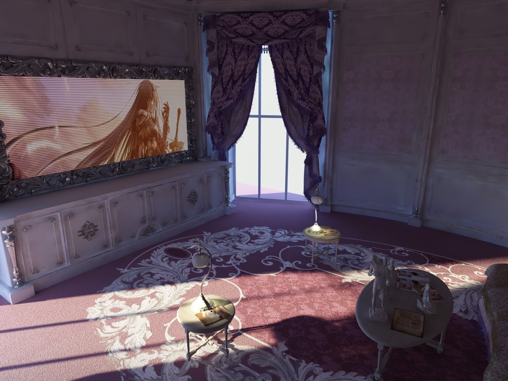 tra laltro non si vede ma di fronte al divano cè uno schermo gigante con cornice tutta intagliata! posto un render di prova che avevo fatto x l'illuminazione!