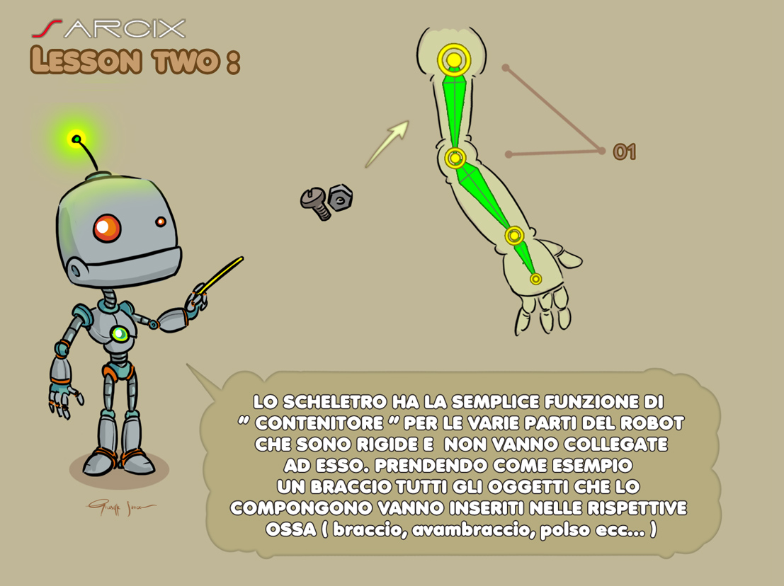 Le parti rigide del robot non vanno collegate ( SKINNATE ) alle ossa, ma vanno inserite al loro interno, così anche se avessi un " avambraccio " del robot pieno di oggetti e particolari, basta raggrupparli ed inserirli dentro l' osso per gestirlo in maniera semplice e veloce.