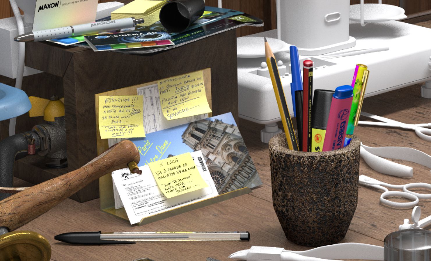 La luce!! secondo me ti verra' una bellissima immagine ma la luce te la rovinera' completamente...non sembrano reali gli oggetti, nonostante la perfetta modellazione e textuizzazione, rischi di perdere tutto nella luce.