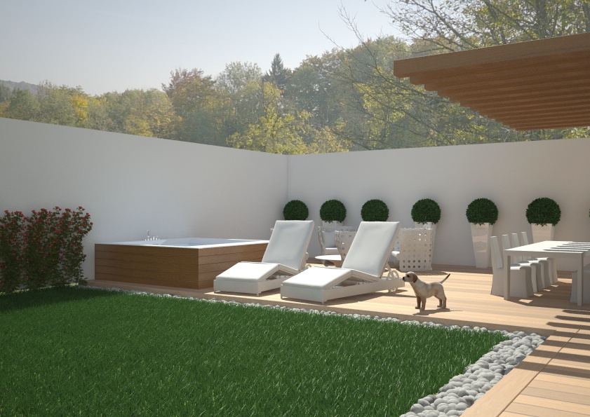 la vasca io l'avrei staccata dal muro, cosi' mi sembra sacrificata in aderenza ad un muro di cinta, e risulta piu' facilmente in ombra .... la vedrei piu' nel mezzo poichè è bello anche girarci intorno ed accederci da qualsiasi parte