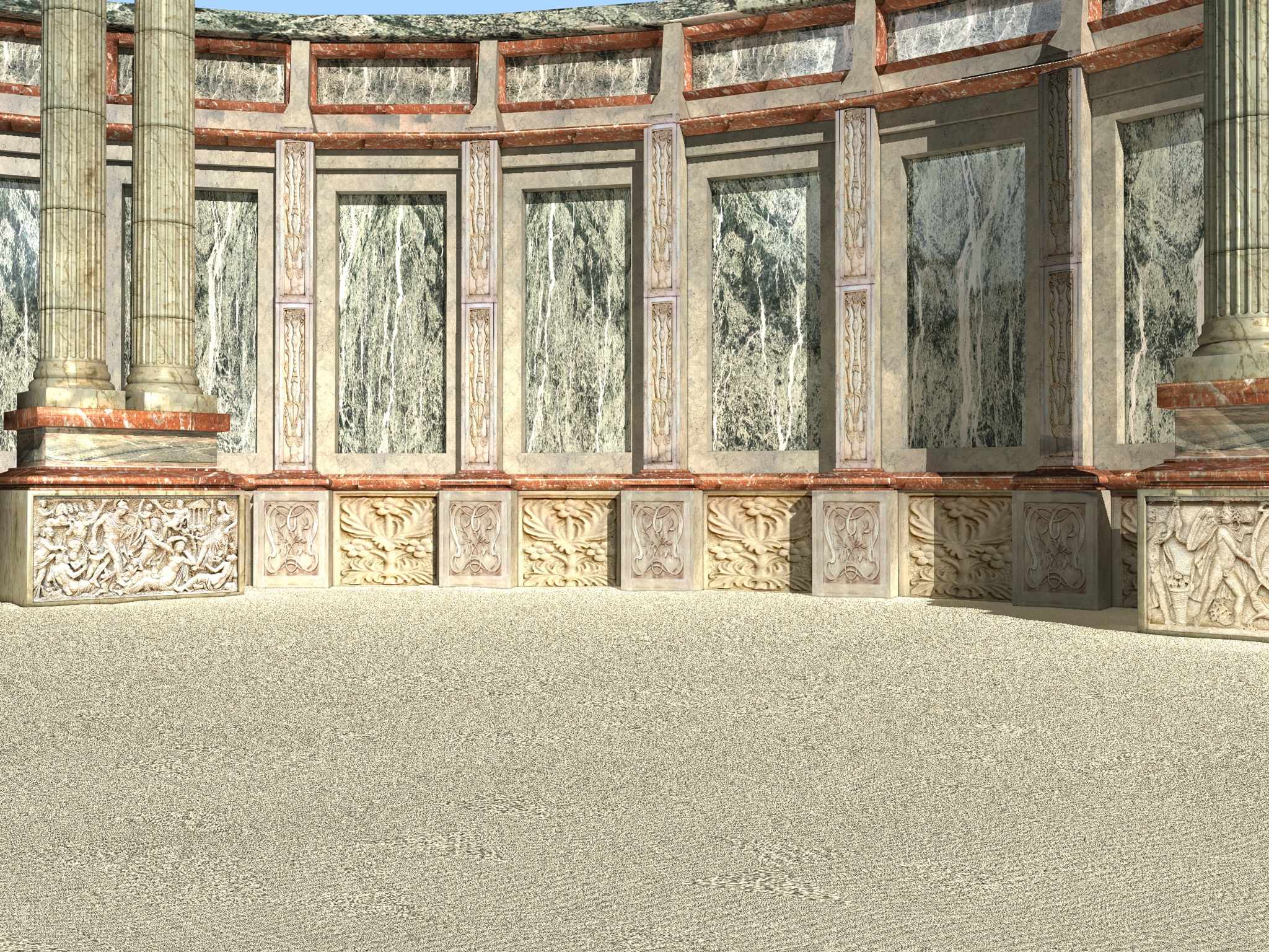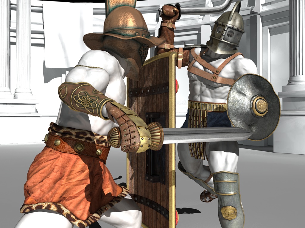 ciao,inutile elogiare il tuo lavoro, xkè parla da sl, posso dire la mia? forse mi sbaglio, ma ad occhio e croce, pensando alla distanza che ci sarà tra i gladiatori e lo sfondo (l'arena) può essere k la tex del marmo (specie quella del cornicione in alto) sia un pò tr grande?, magari dico una cavolata, ma mi ha dato qst impressione...per il resto, cacchio è spettacolare davvero....