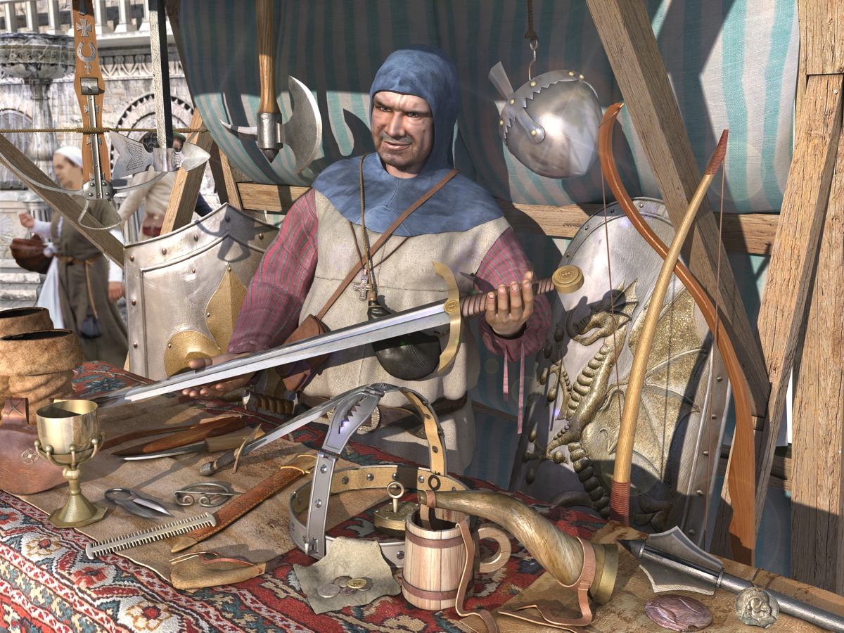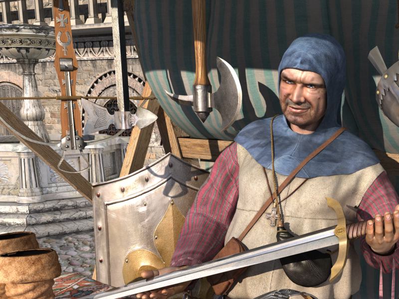 Passato un po il faccino del mercante in zbrush per caratterizzarlo maggiormente.. cambiata leggermente l'inquadratura per inserire un minimo di sfondo e alzato il sole di 2 gradi nell'asse y per far in modo che gli occhi fossero maggiormente illuminati.